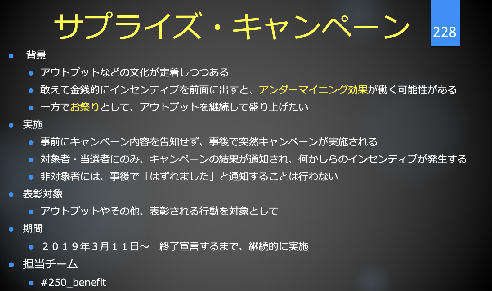 その場合は、SlackのDMなどで個別に表彰や金銭的インセンティブの付与を行った