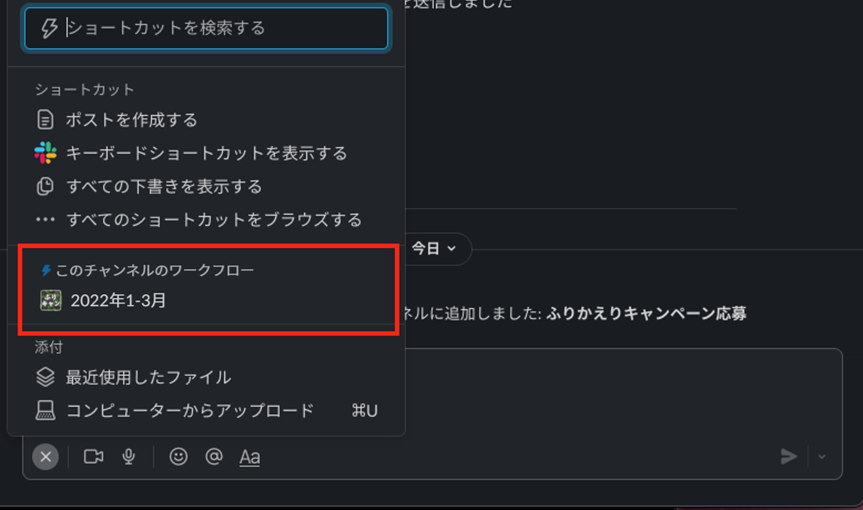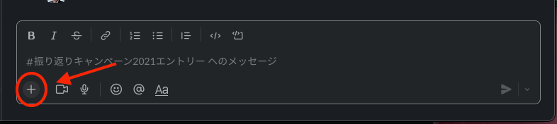 チャンネルのメッセージ入力部分左下の「+」マークを押す