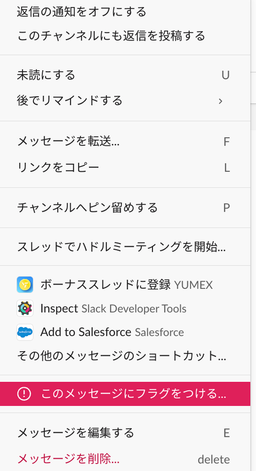 投稿内容の削除判断については、Slackのフラグ管理機能を使う形にしました、メッセージ毎にフラグを立てるとコンテンツ管理者が削除判断を行います