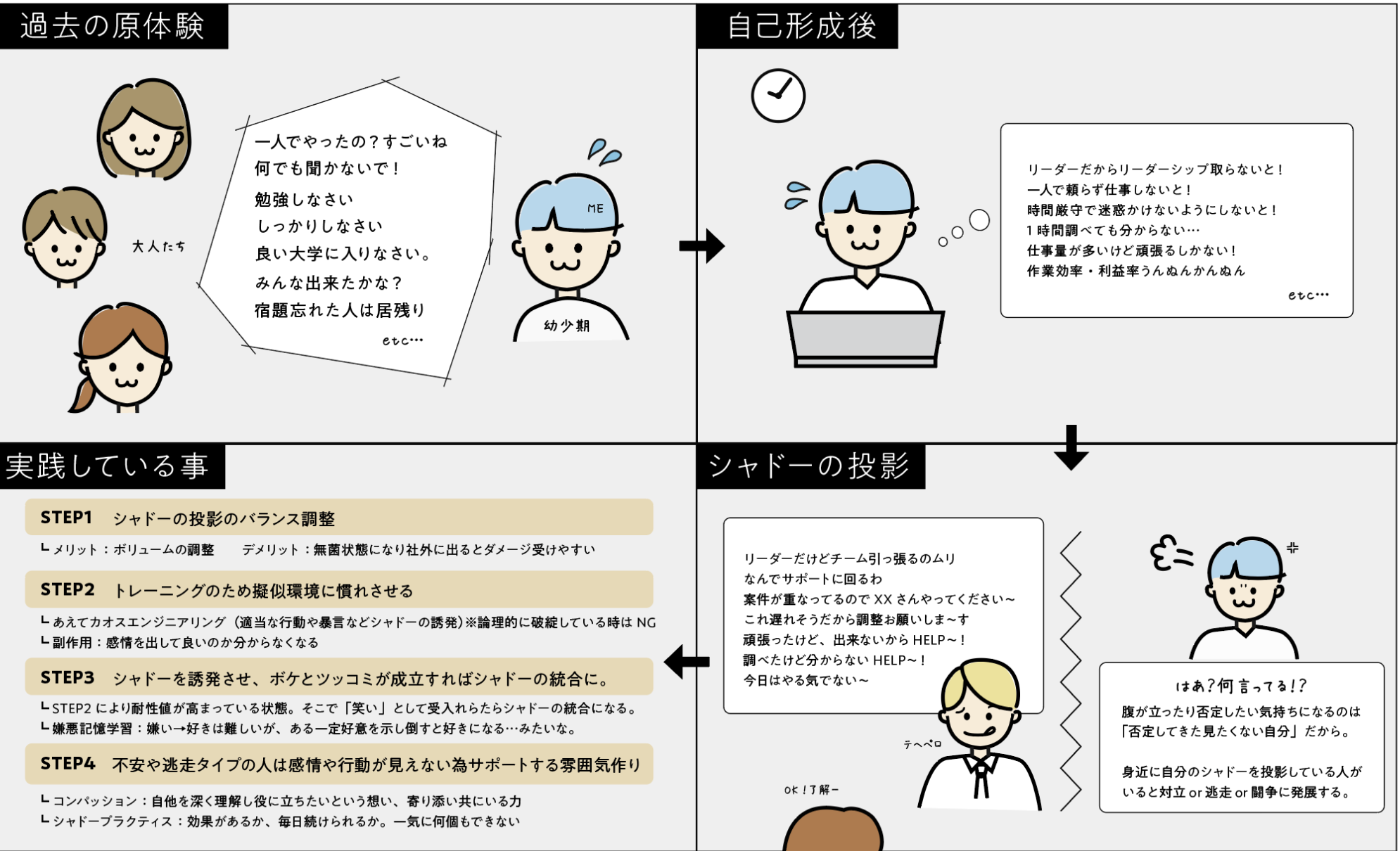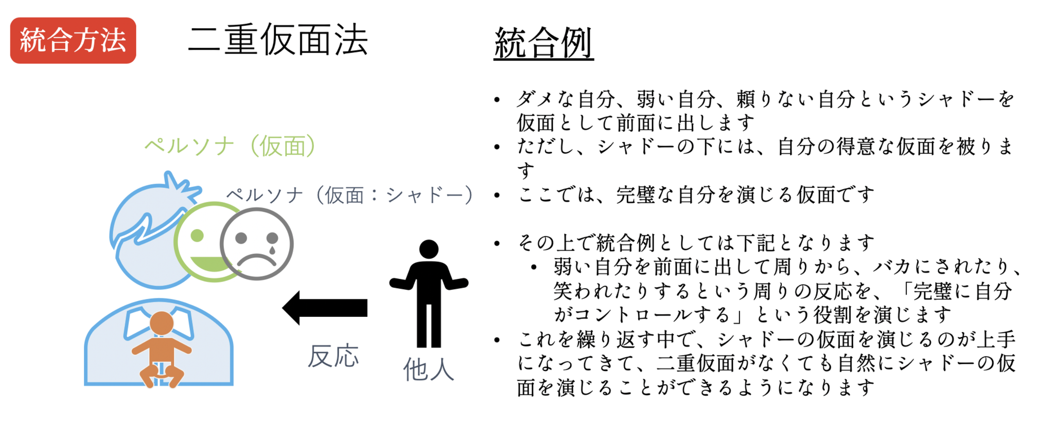 具体的には、シャドーの仮面をつける際に、「え?片岡さんもそうだったんだ」と驚かれたりする事で、びっくりさせる事を実現します。敢えて、上手くできない自分を強調したり、大袈裟に振舞う形になります。悪戯心を持って、シャドーの仮面を見せるのです。