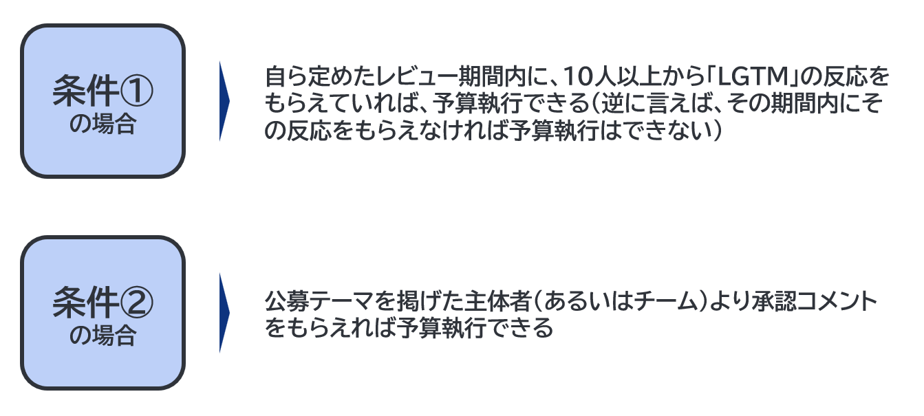 ・ 執行内容 : 提案されたものに対し、予算執行を承認する範囲を記載する(例えば、ひとつのプロリク内に複数の提案がある場合などを想定)