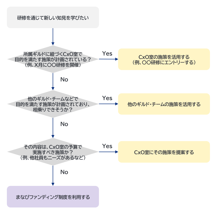 本制度を利用するかどうか迷った際、以下のような思考プロセスで考えると良いでしょう(図示したフローチャート図は、外部研修を受講すべきかどうかを想定した場合)。ポイントは、ゆめみのメンバーが共通的に抱える成長課題は、各CxO室を中心として検討されている可能性が高い(あるいはCxO室の予算内で計画されている)という点です。
