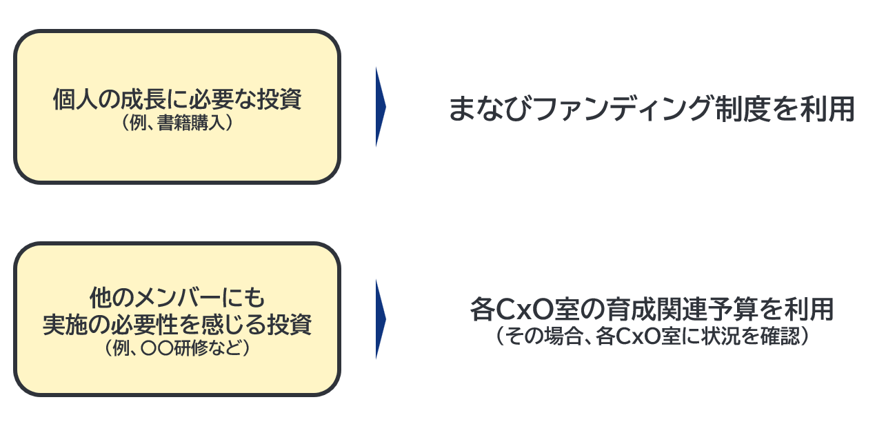 2024年は、各CxO室に育成関連予算を割り振り、現場ニーズなどを踏まえた育成施策を検討いただいています(その予算も、人数に応じた分を見積り、割り振っています。詳細はこちら)。他のメンバーも同様のニーズがありそうなら、一度、各CxO室に相談してみましょう。