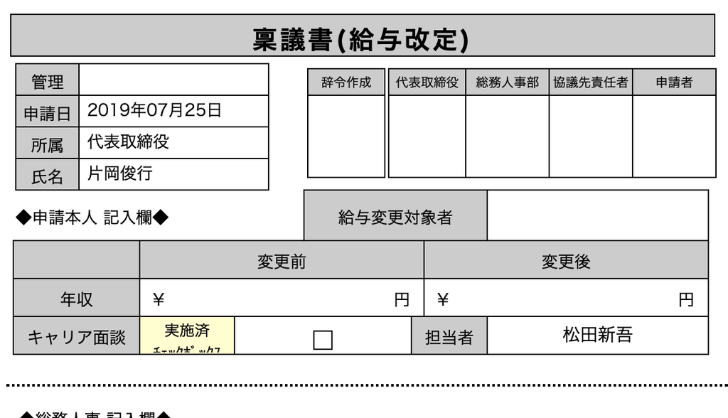 ゆめみの給与決定方法は最終的にはX-pointの人事稟議>稟議書(給与改訂)で申請を行い承認(追認)された内容で確定されます