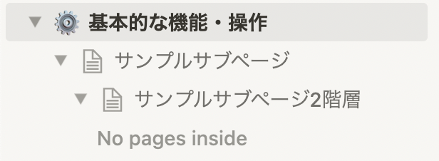 コマンドでページを作成した場合,作成されたページはサブページとなります.この時,サイドバーを見てみますと,階層構造が生成されているかと思います.このように,Notion ではサブページを作り階層構造を無限に生成できます.
