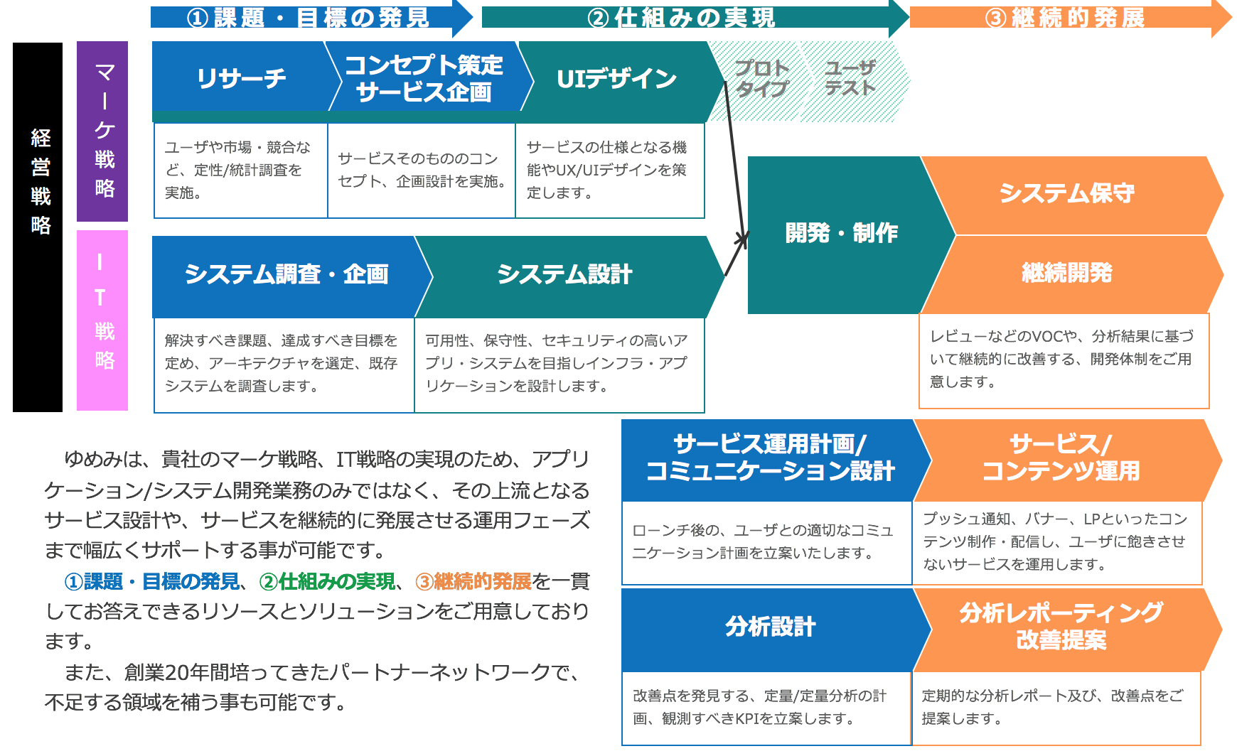 メインとなるのはスマホアプリ・Webサイトといった「企業と生活者の接点」となるWebサービスを、総合的にプロデュースする、もしくは部分的に役務提供します。