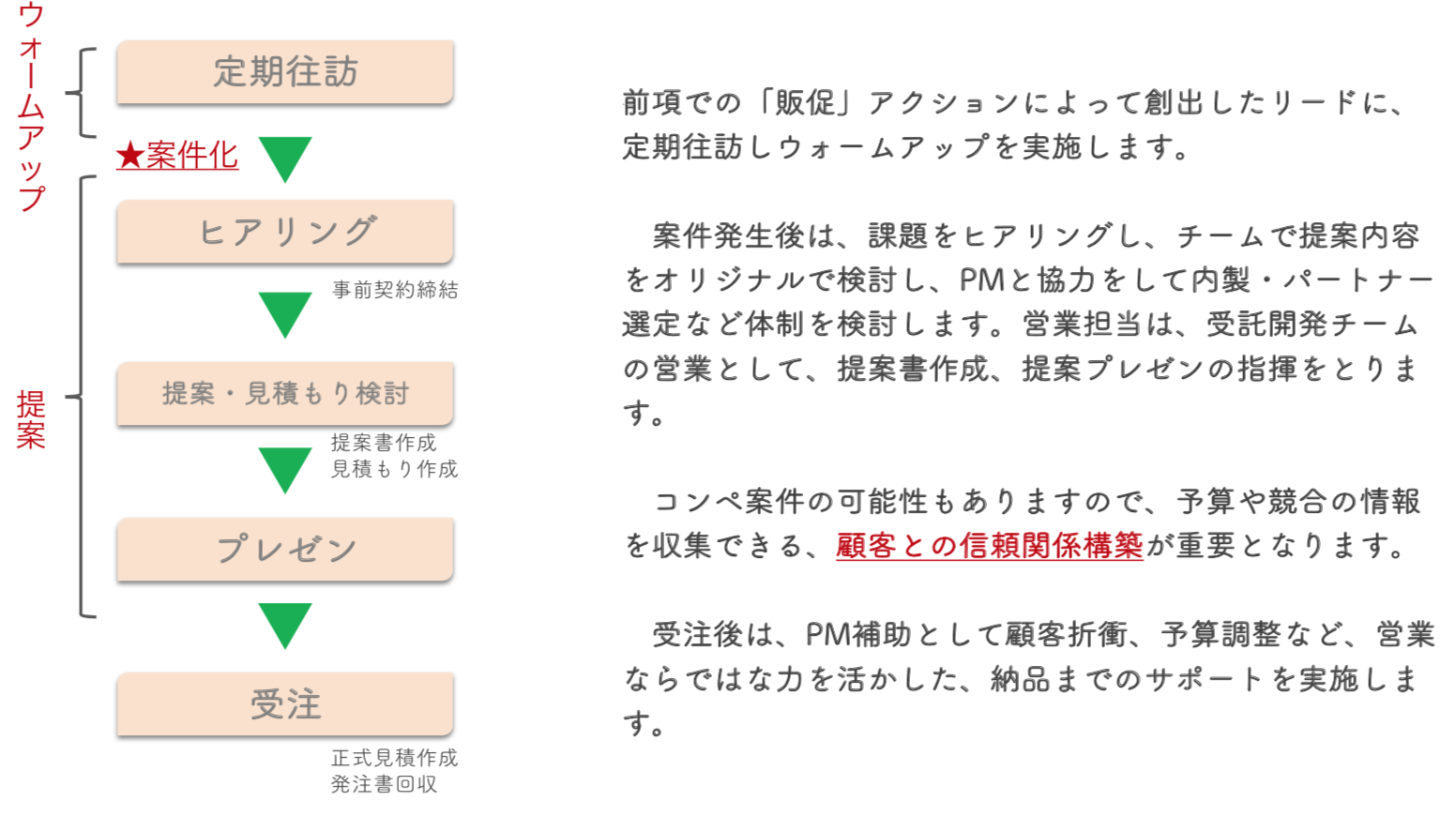 顧客要望に真摯にかつ、正直にお応えすること。会食などリアルな接点での親交を深める等。※営業担当ごとにアプローチや得意な方法は多少変わります。