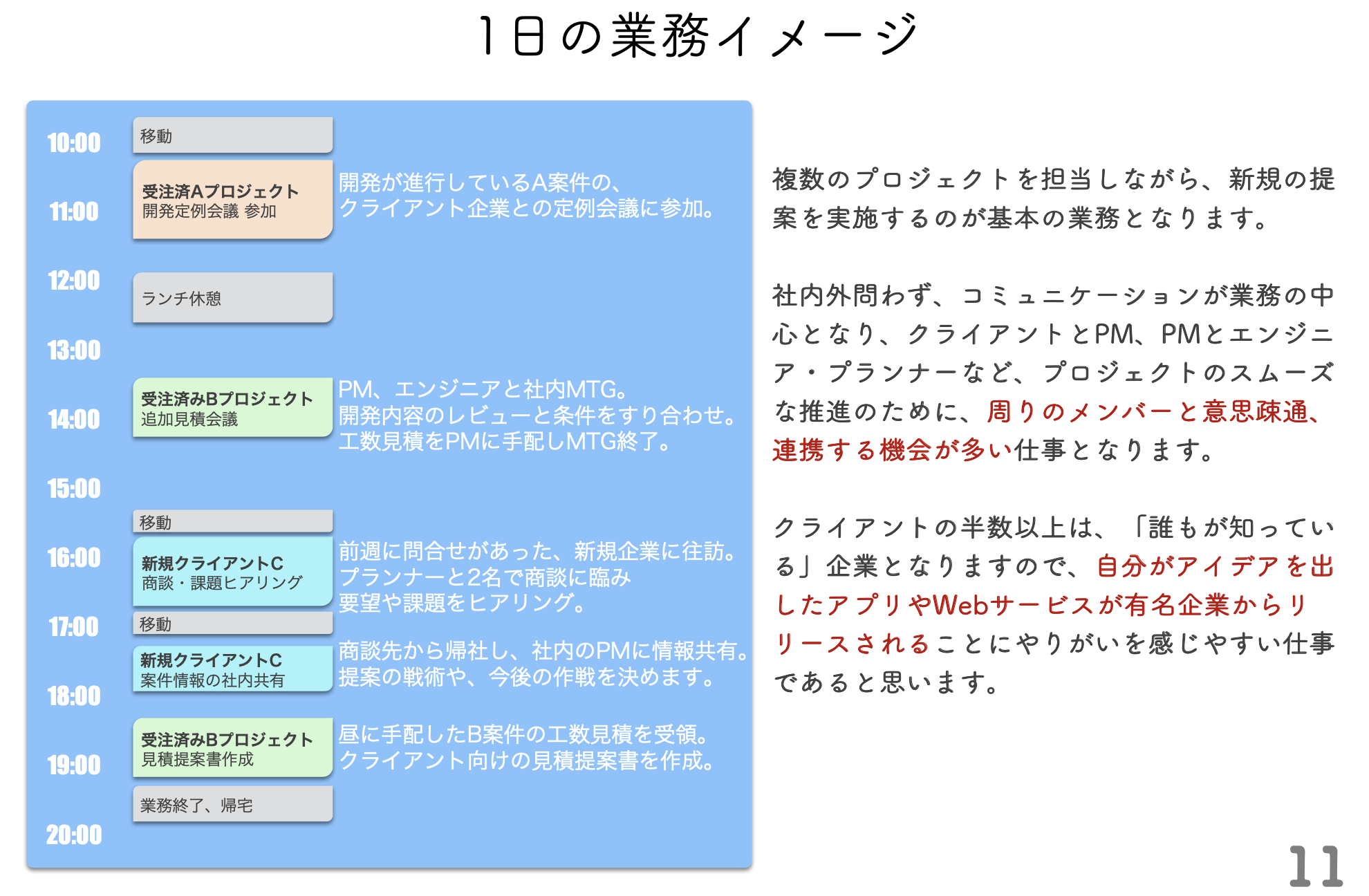 案件1件の取扱い規模が大きく、実際に仕事を通じてエンジニア・クリエイターと直接コミュニケーションが取れて知見を獲得できる