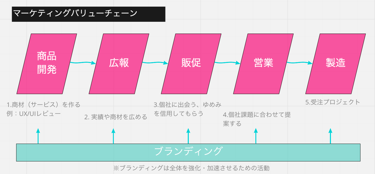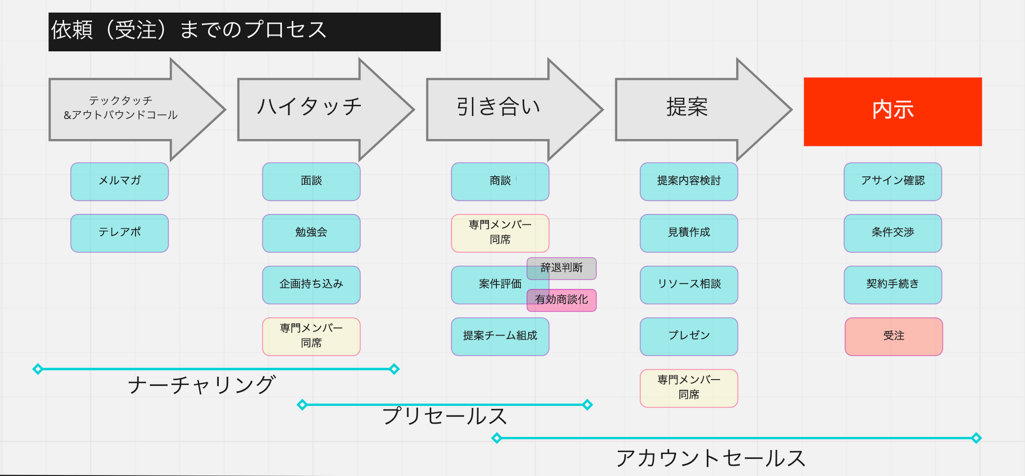 ゆめみの営業は、マーケティングの一部と位置づけられていますが、主軸となる担当領域は、上記図における、リードジェン・ナーチャリング・プリセールス・アカウントセールスとなります