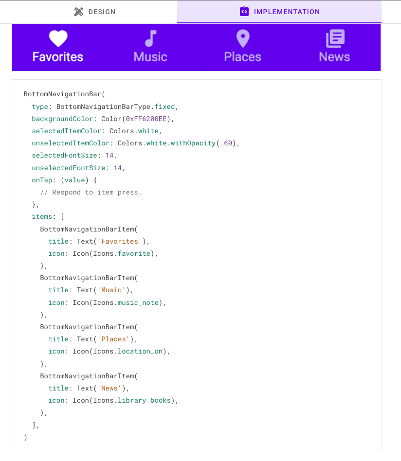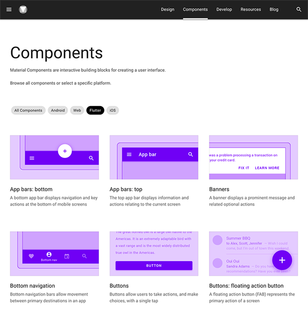 Material Design のサイトでは、コンポーネントは Flutter でどのようなコードを記述すればいいかの例が記載されている