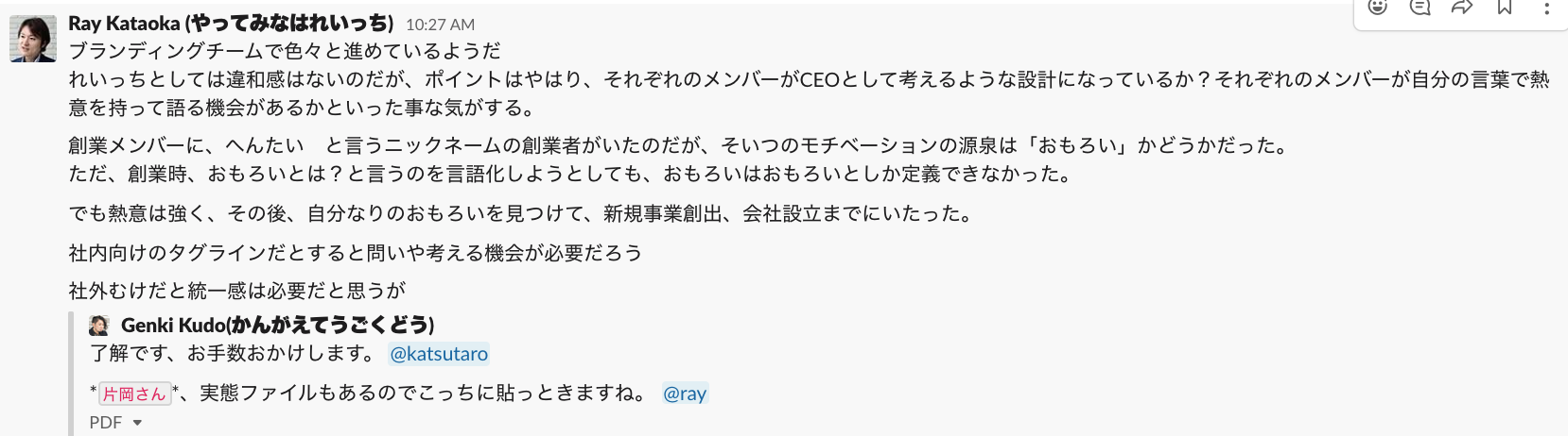 れいっちとしては違和感はないのだが、ポイントはやはり、それぞれのメンバーがCEOとして考えるような設計になっているか?それぞれのメンバーが自分の言葉で熱意を持って語る機会があるかといった事な気がする。創業メンバーに、へんたい と言うニックネームの創業者がいたのだが、そいつのモチベーションの源泉は「おもろい」かどうかだった。