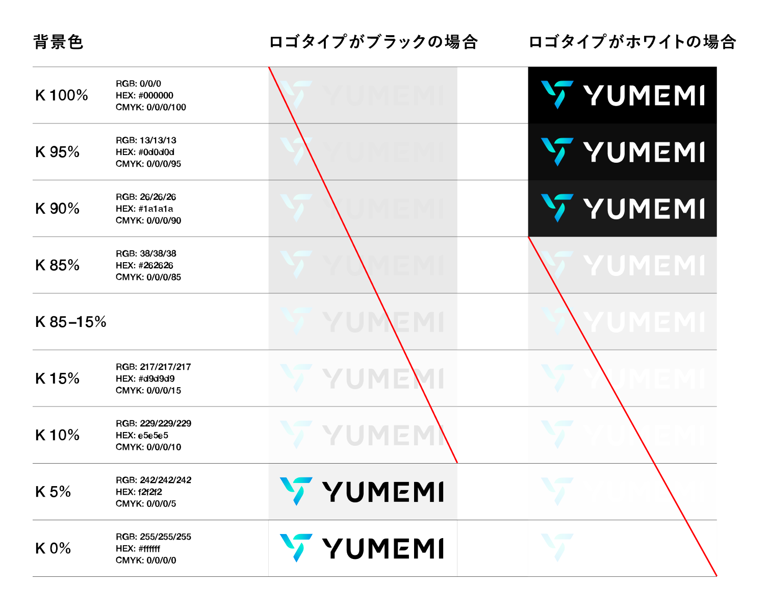 ロゴタイプがブラックの場合はK0~5%、ロゴタイプがホワイトの場合はK90~100%であれば使用可。