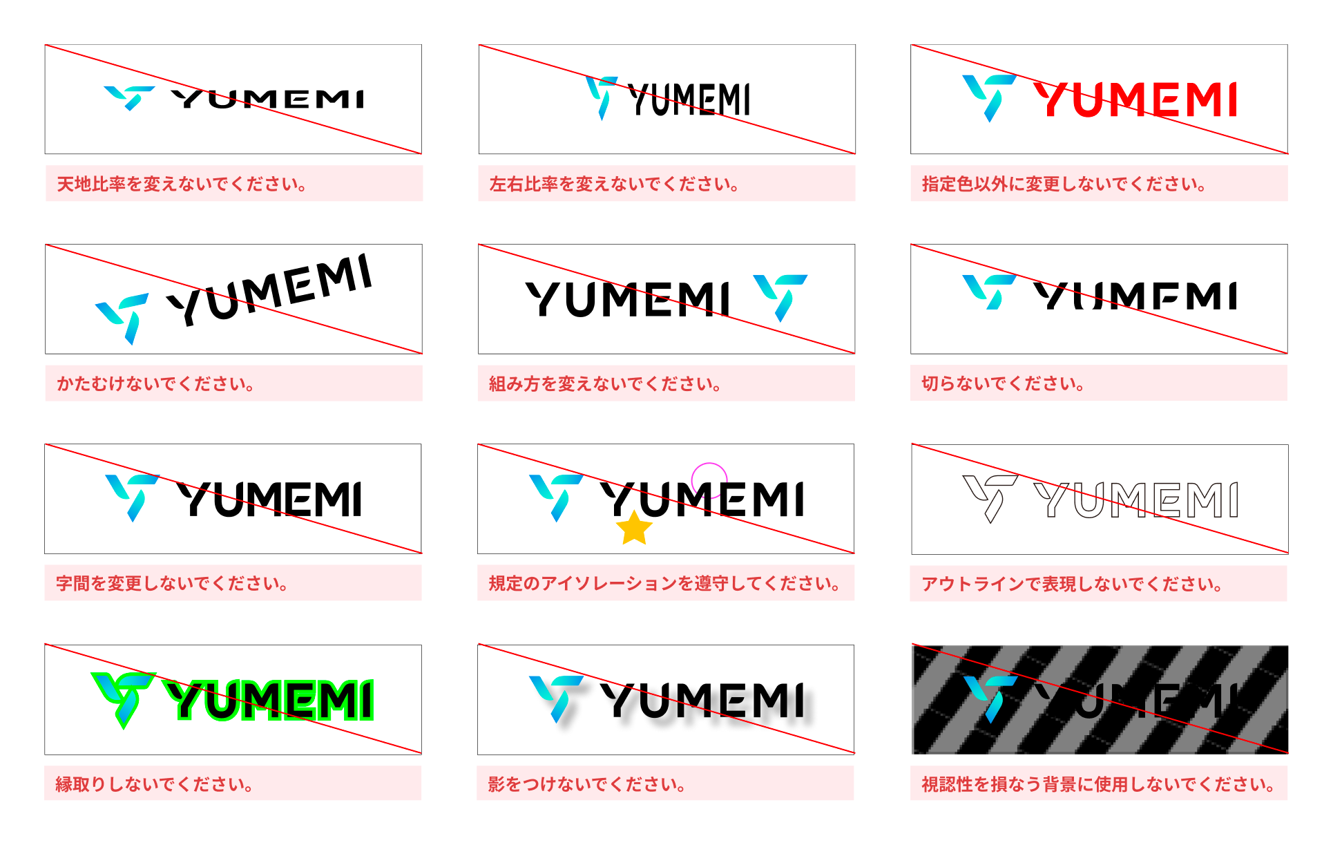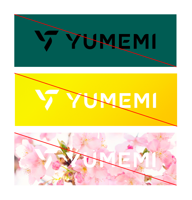 基本的には上図のような使用を禁じます。イレギュラーな形で使用する場合にはブランドレギュレーション担当者に確認を取ってください。