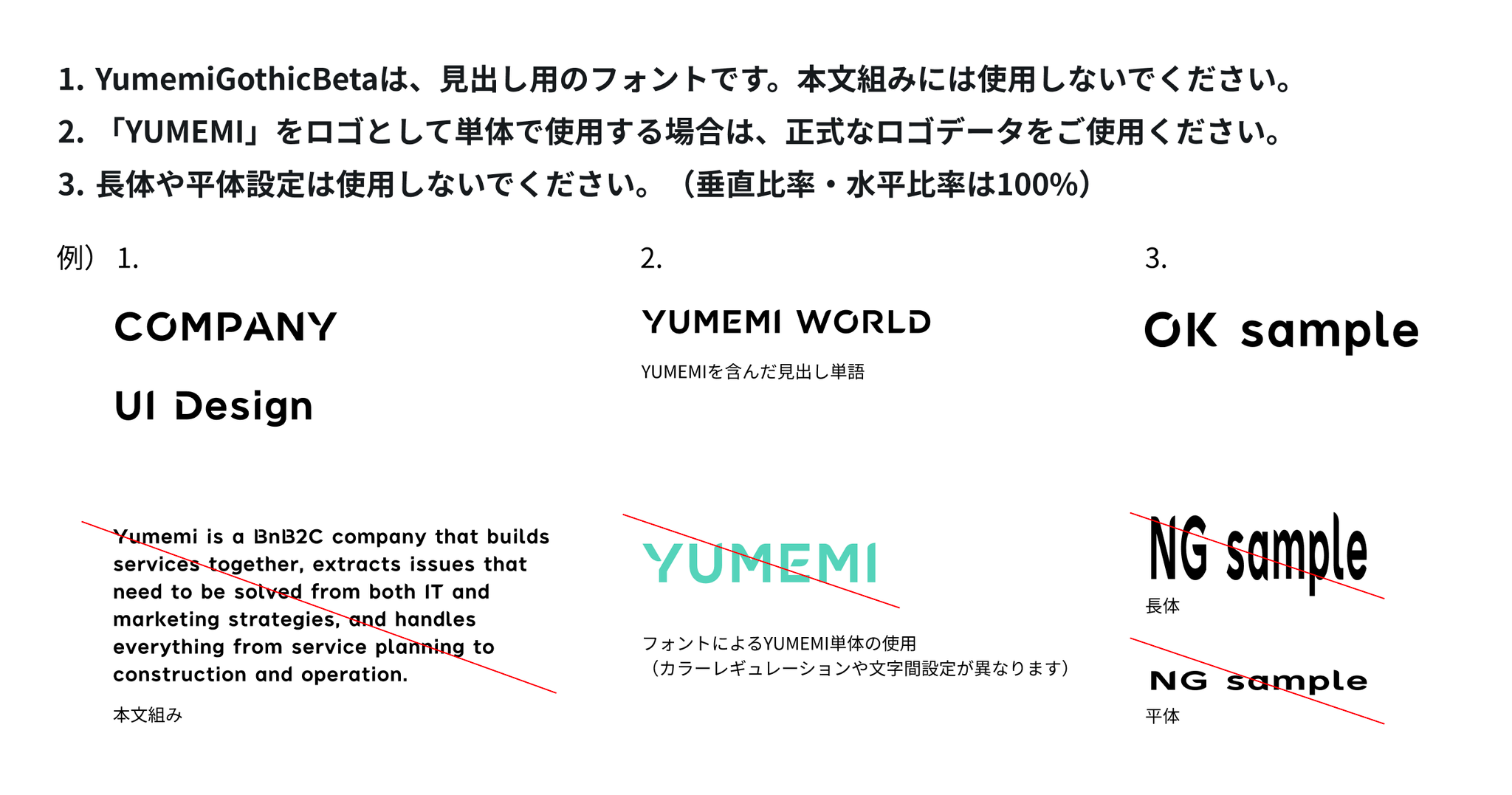 YUMEMI Gothicは必ず使わないといけない書体ではありません。 目的やターゲットに合わせて、「ゆめみらしい」ビジュアルづくりにうまくご活用ください。 ※ 装飾性が強い他の書体で「YUMEMI」を表現することは極力避けてください。