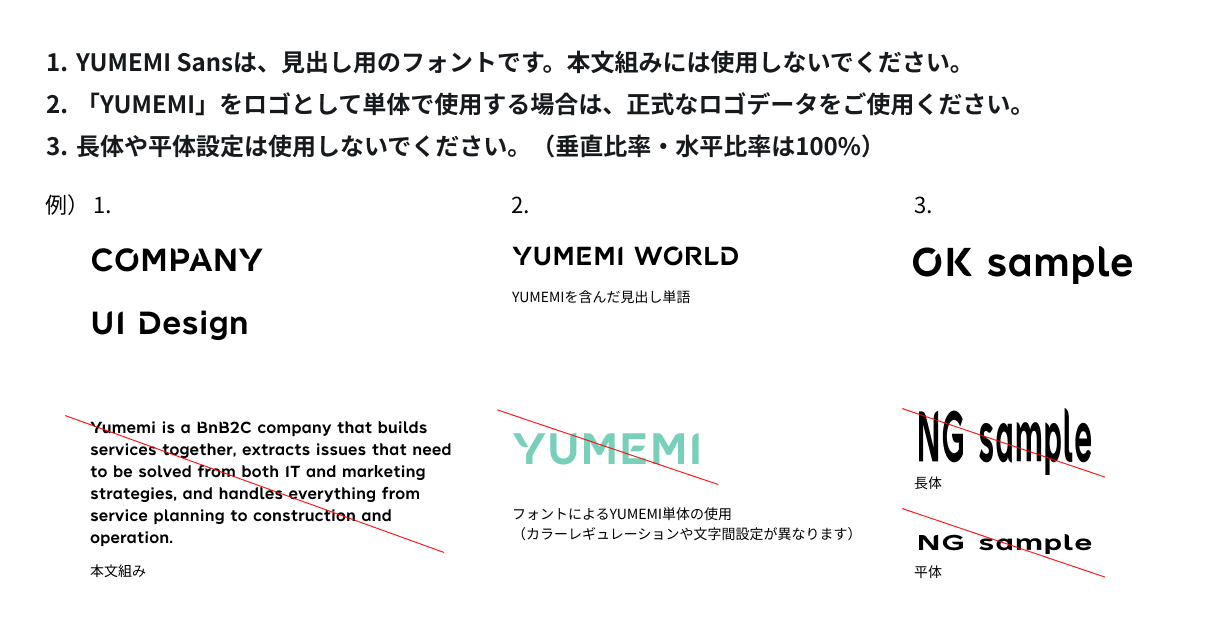 YUMEMI Sansは必ず使わないといけない書体ではありません。 目的やターゲットに合わせて、「ゆめみらしい」ビジュアルづくりにうまくご活用ください。 ※ 装飾性が強い他の書体で「YUMEMI」を表現することは極力避けてください。