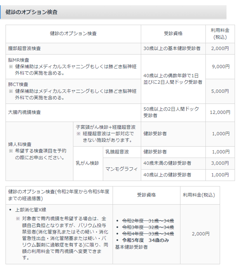 以下のオプション検査(受診資格年齢をよくご確認ください!
