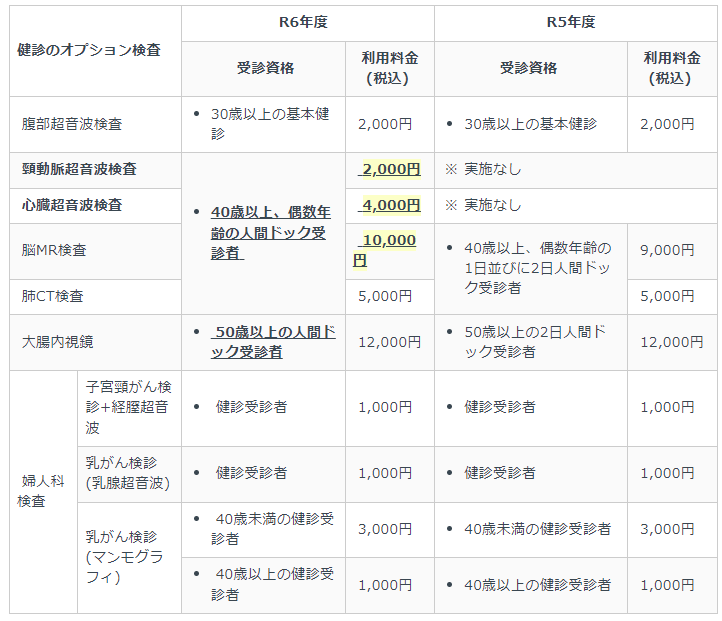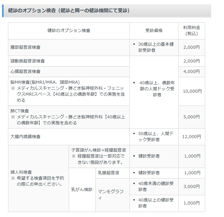 以下のオプション検査(受診資格年齢をよくご確認ください!年度末年齢です!2025/3/31時点)