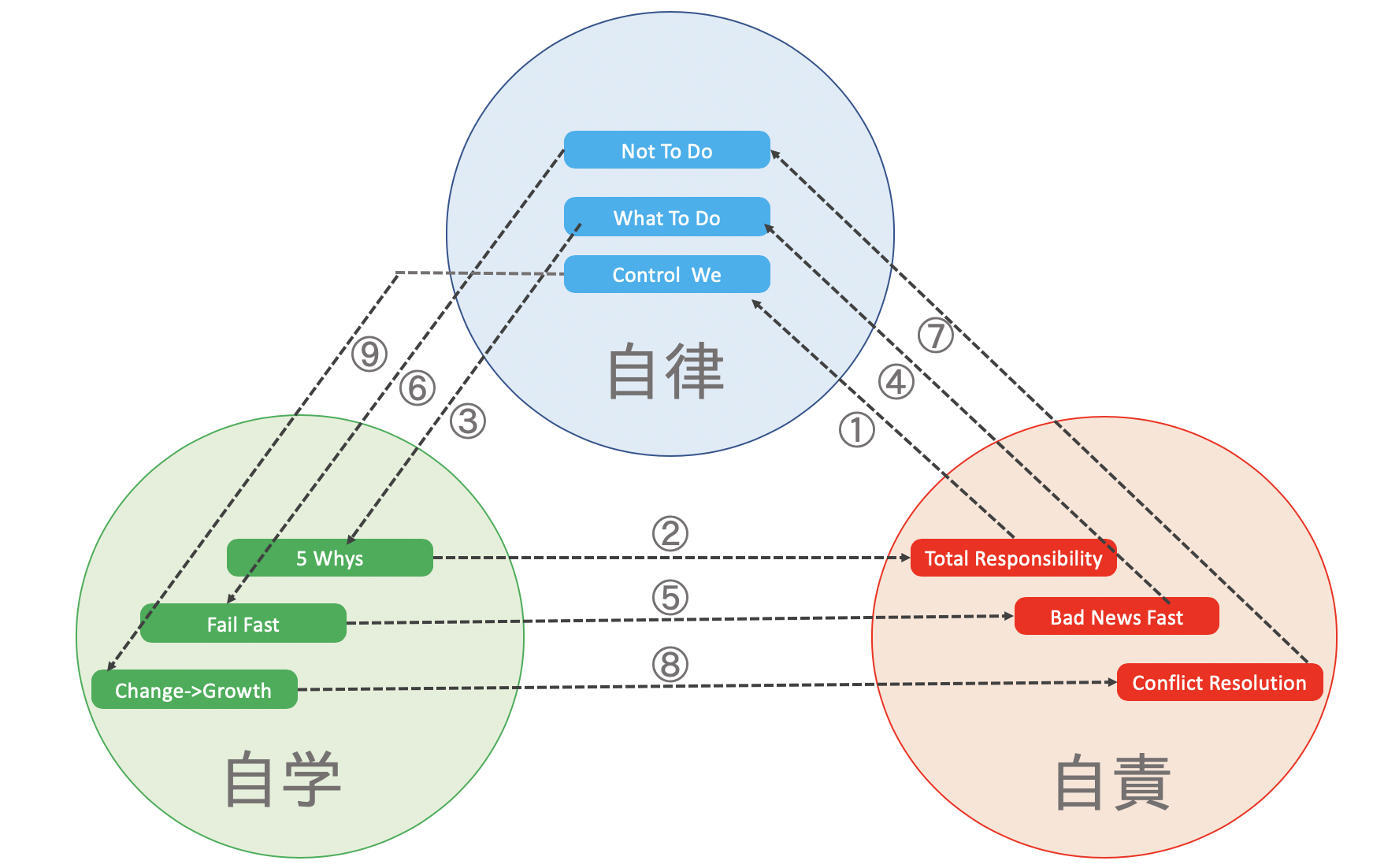 自律・自学・自責については、特に社内教育の一環として理解を促すことをするというよりは、敢えて説明はせずに、自己正当化する人がいる場合に本来の定義を説明する材料とする