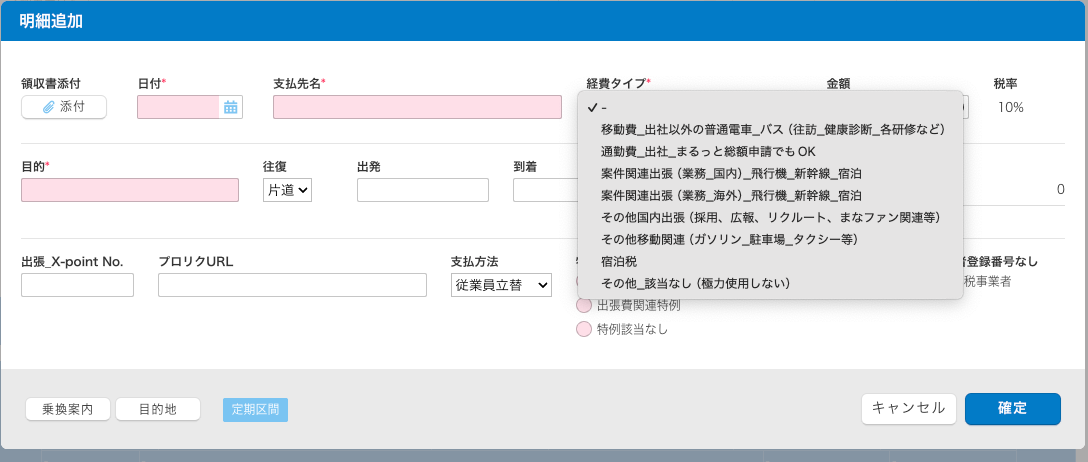 本来の定期経路(会社までの移動費用)。出張の場合はこちらは利用しない。精算時、利用金額の総額で申請OK