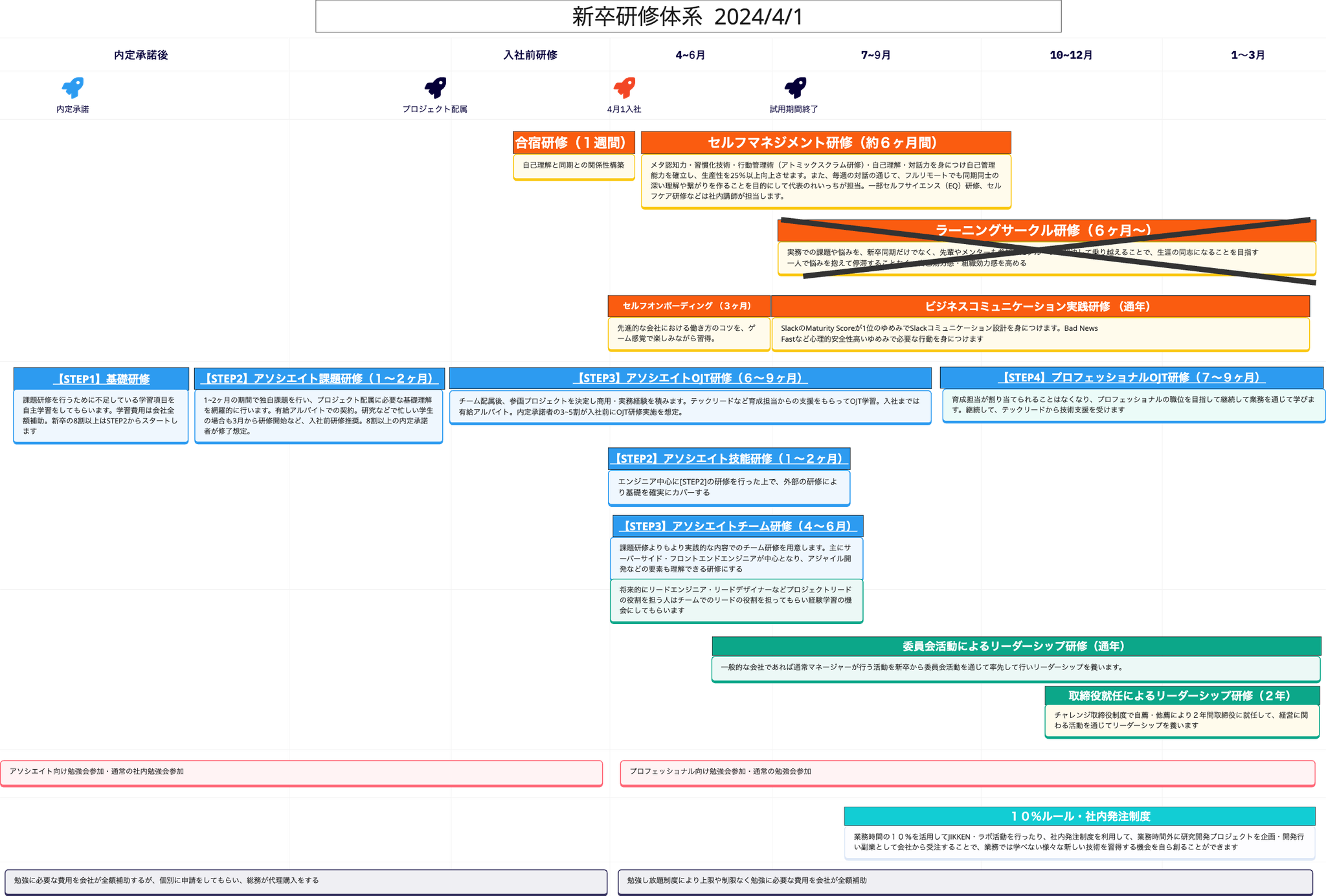 新卒向けに実施している育成体系(miro)を示す