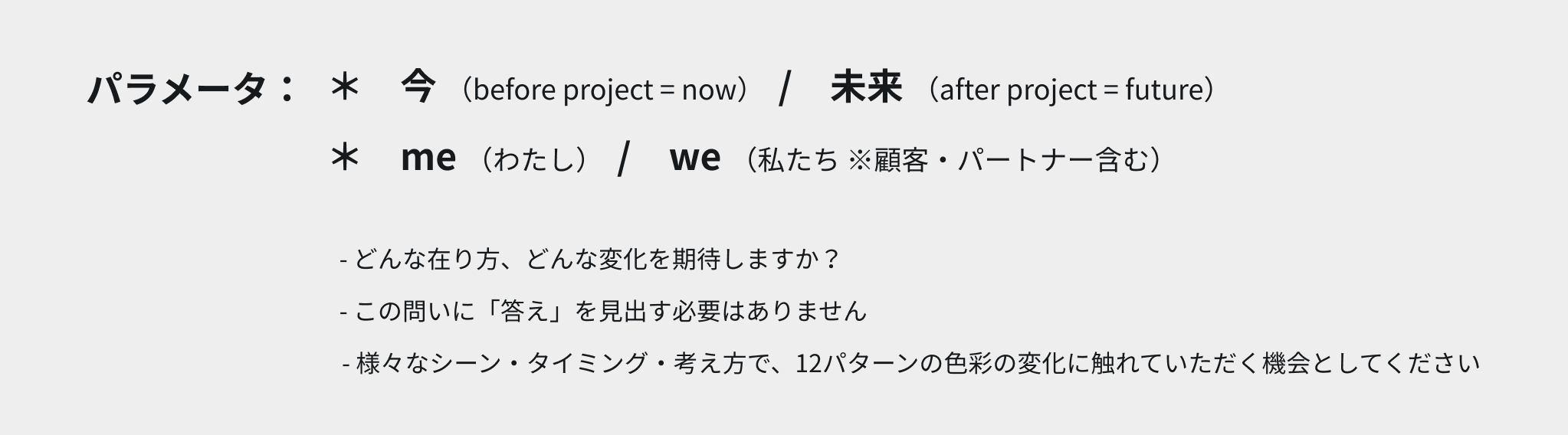 下記パラメータを軸に、個人個人が内省し、使用シーンに合わせて意思を持って色を選んでください。