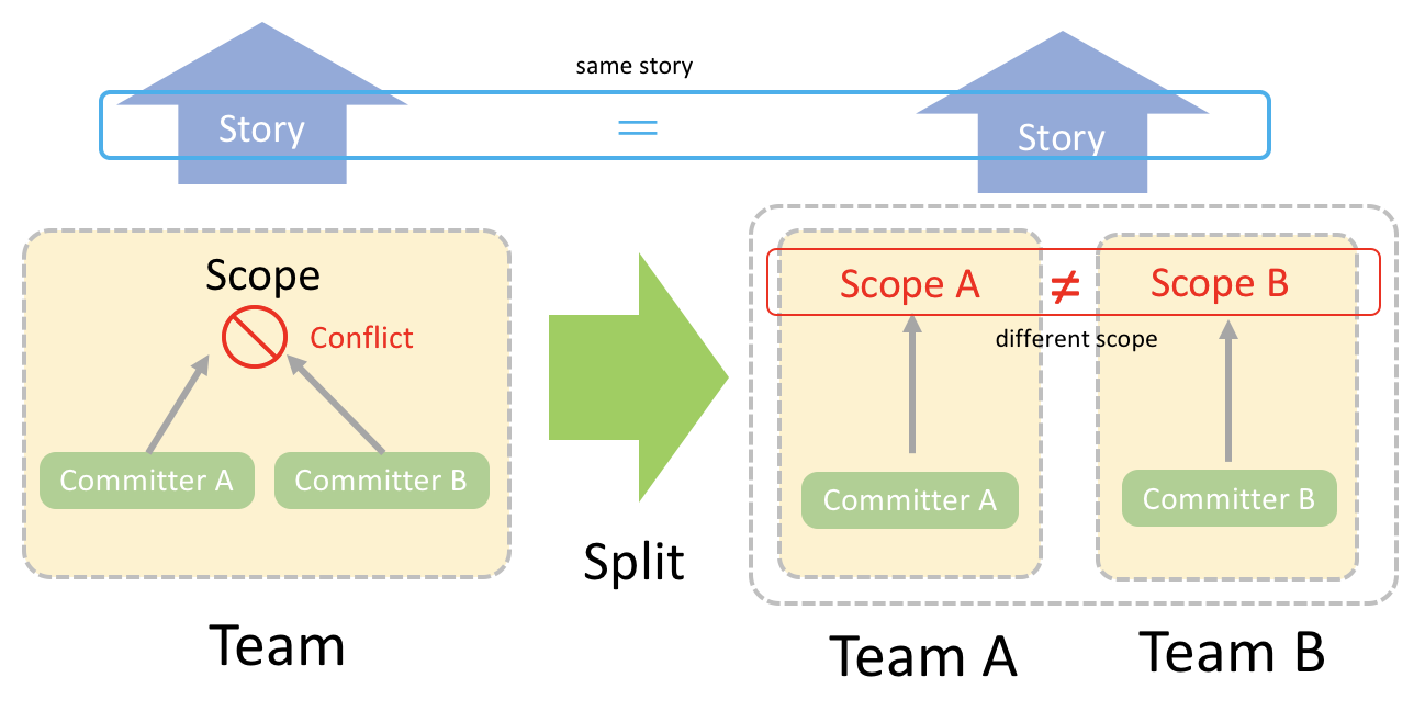 ただし、分割されたチームは同じストーリーを共有することになるが、スコープはそれぞれのコミッターの考えに基づいて異なる