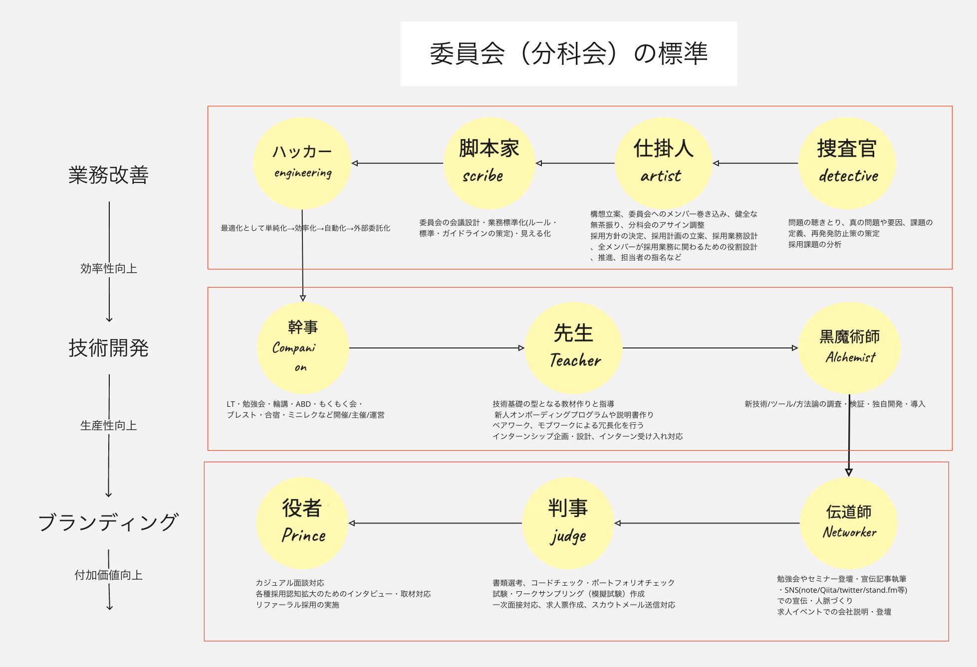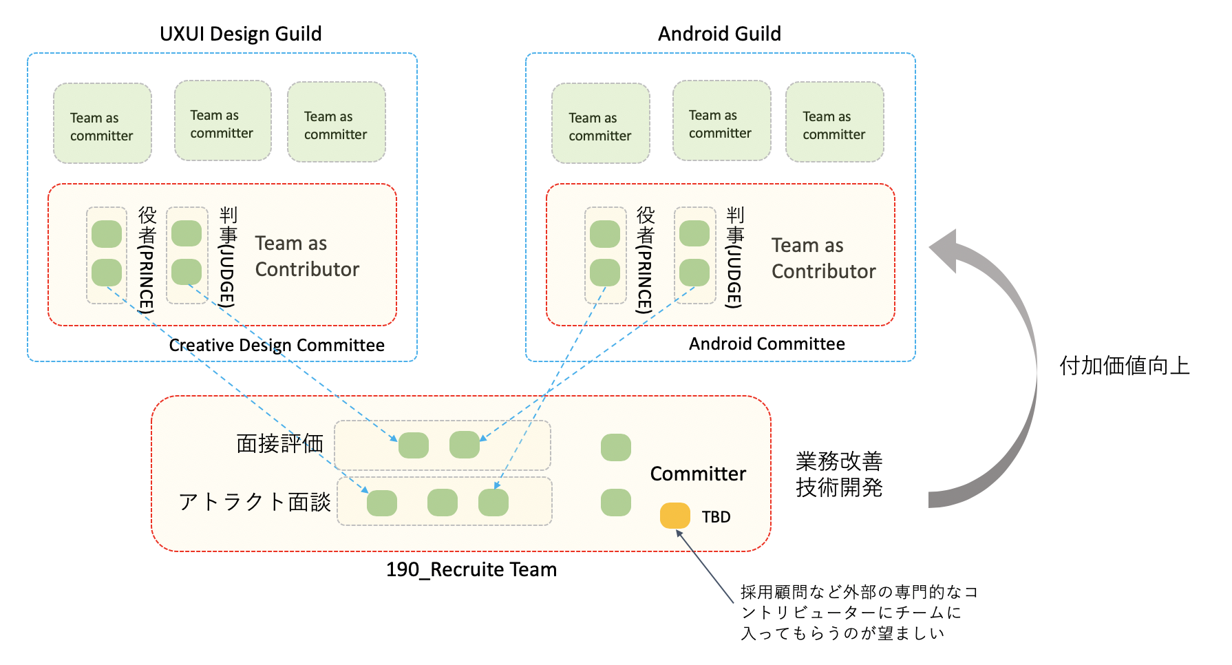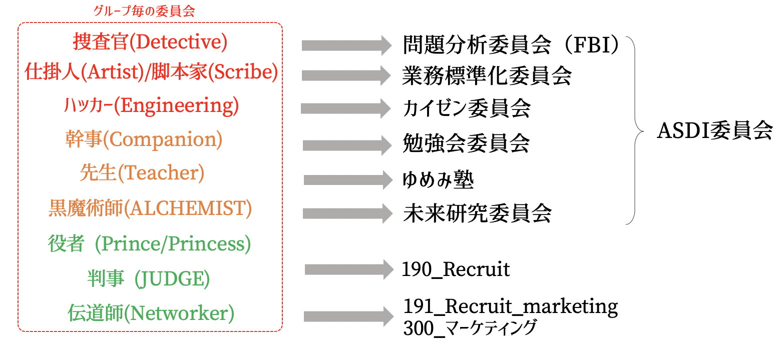 上記では、190_Recruit(採用)に各ギルドの委員会の分科会である「役者」「判事」の一部のコミッターが集まって、面接評価やアトラクトのプロセス改善を、Recruitチームのコミッター に提言することを意味している
