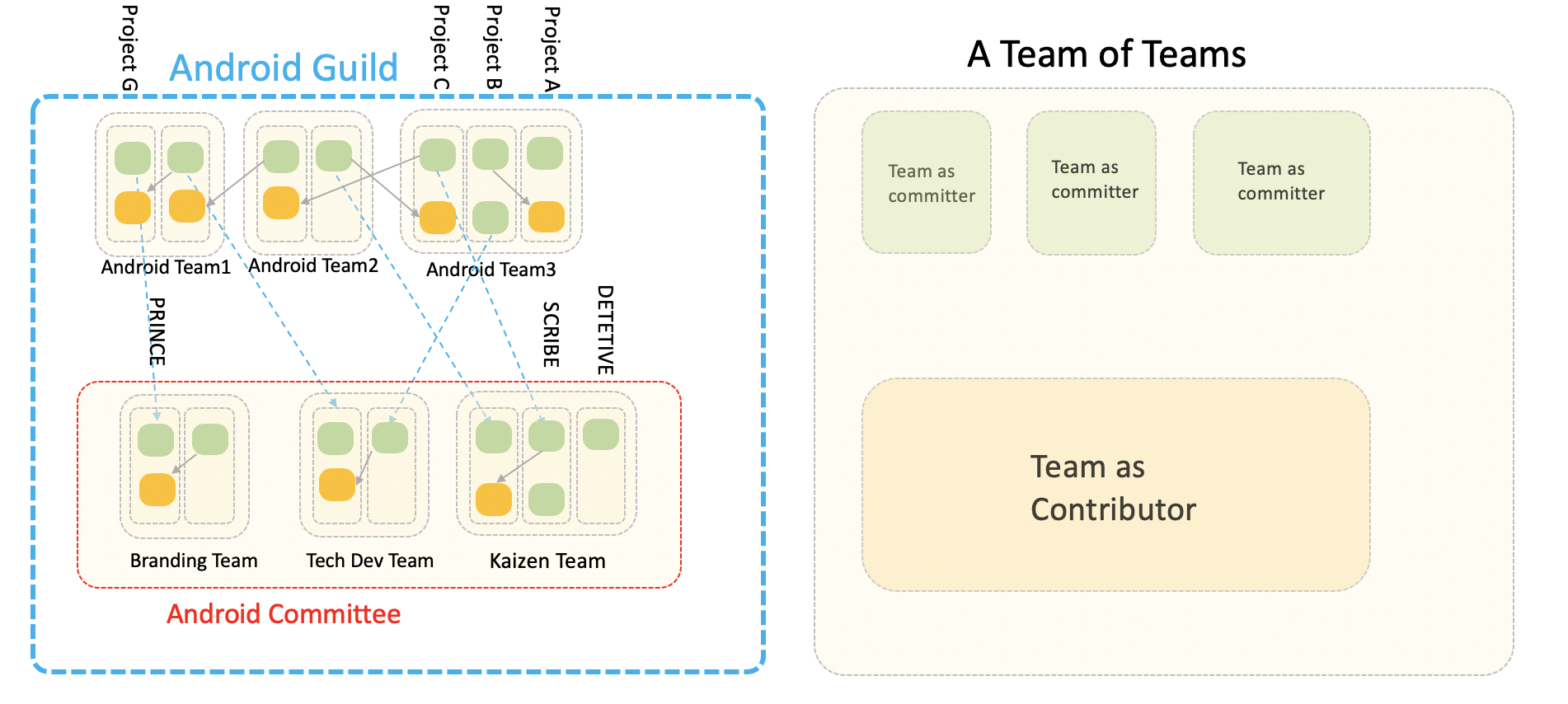 以上のような設計により、下記のようにAndroidグループと委員会はチーム・オブ・チームズの構造をとり、二つを合わせて「ギルド(Guild)」と呼ぶ