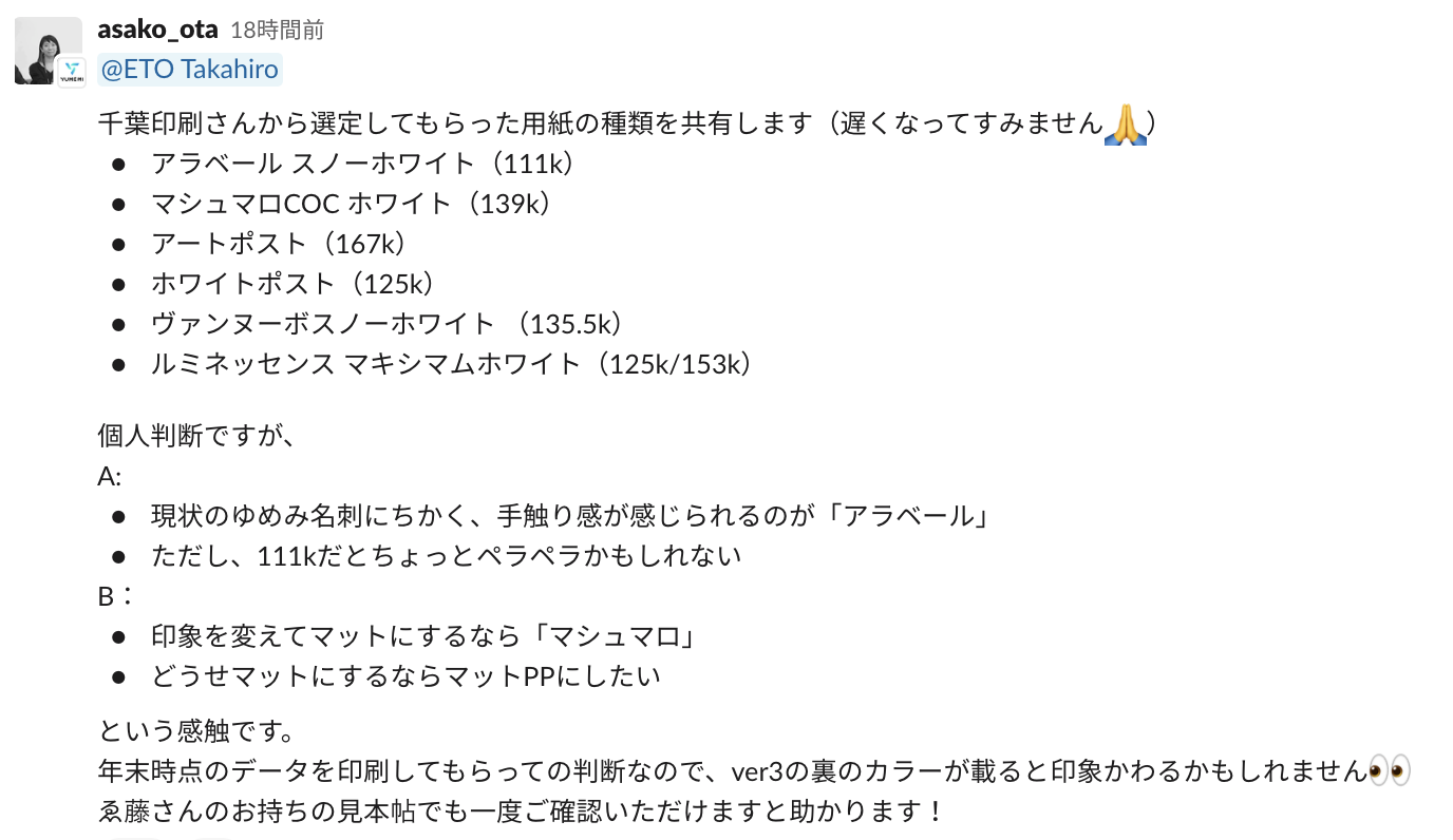 紙質は、「デジタルの会社だけど」感に期待したい(顧客とのアイスブレイクになる)