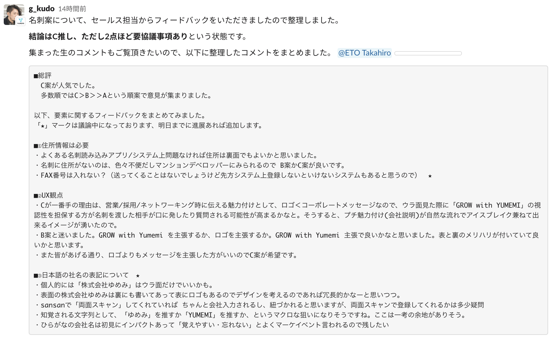 全案とも一般的な名刺の印象はあるが営業メンバーにも印象確認してみる @Genki Kudo