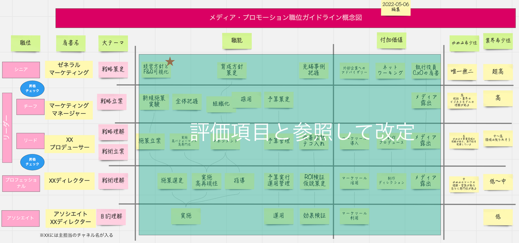 「職位」は5階層にわかれており、それぞれに大まかなテーマと、求められる職能レベルを設定した