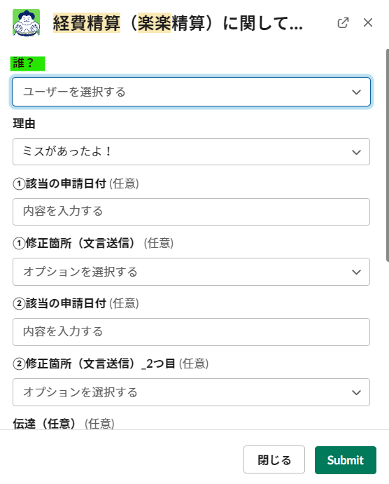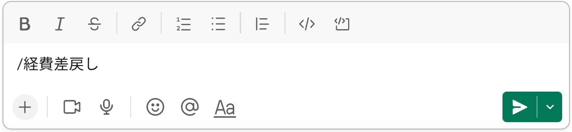 slack上で/expenses、もしくは/経費差し戻しと入力し送信