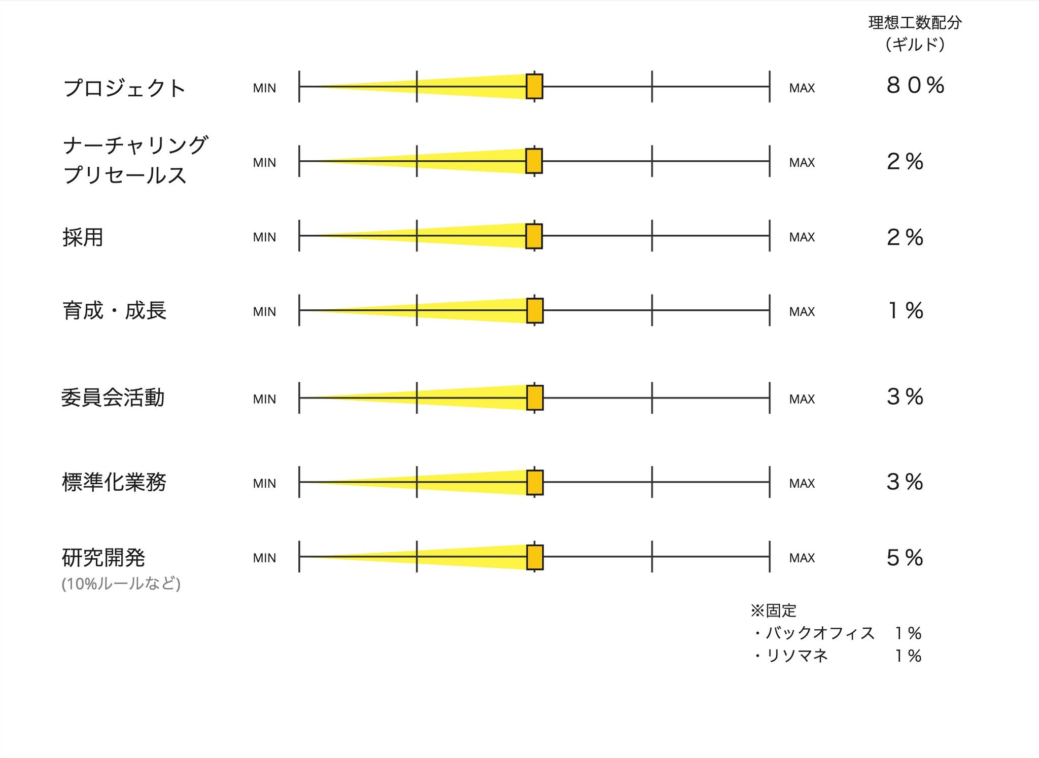 理想工数配分の%部分は目安として、特定の間接業務に力を入れたい場合など、間接ウェイトの微調整はギルドごとに実施いただければと思います