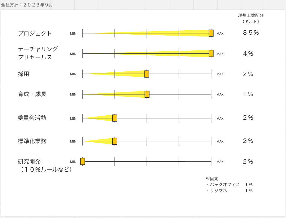トレードオフスライダーには、理想工数配分(全社として2023年9月時点で理想とする工数配分)も併記されています